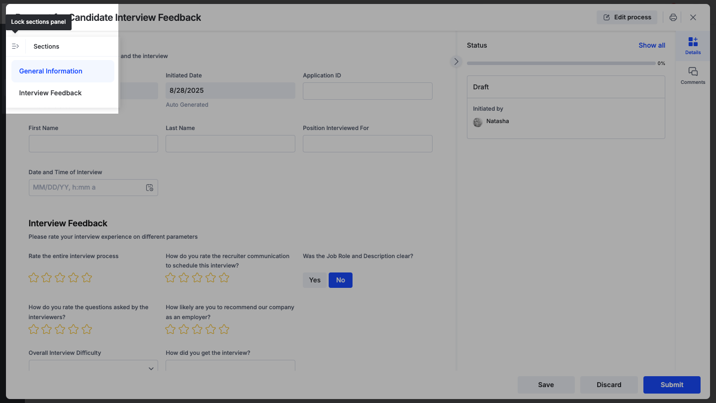 You can navigate to the different sections of a process form by hovering over the quick access menu (