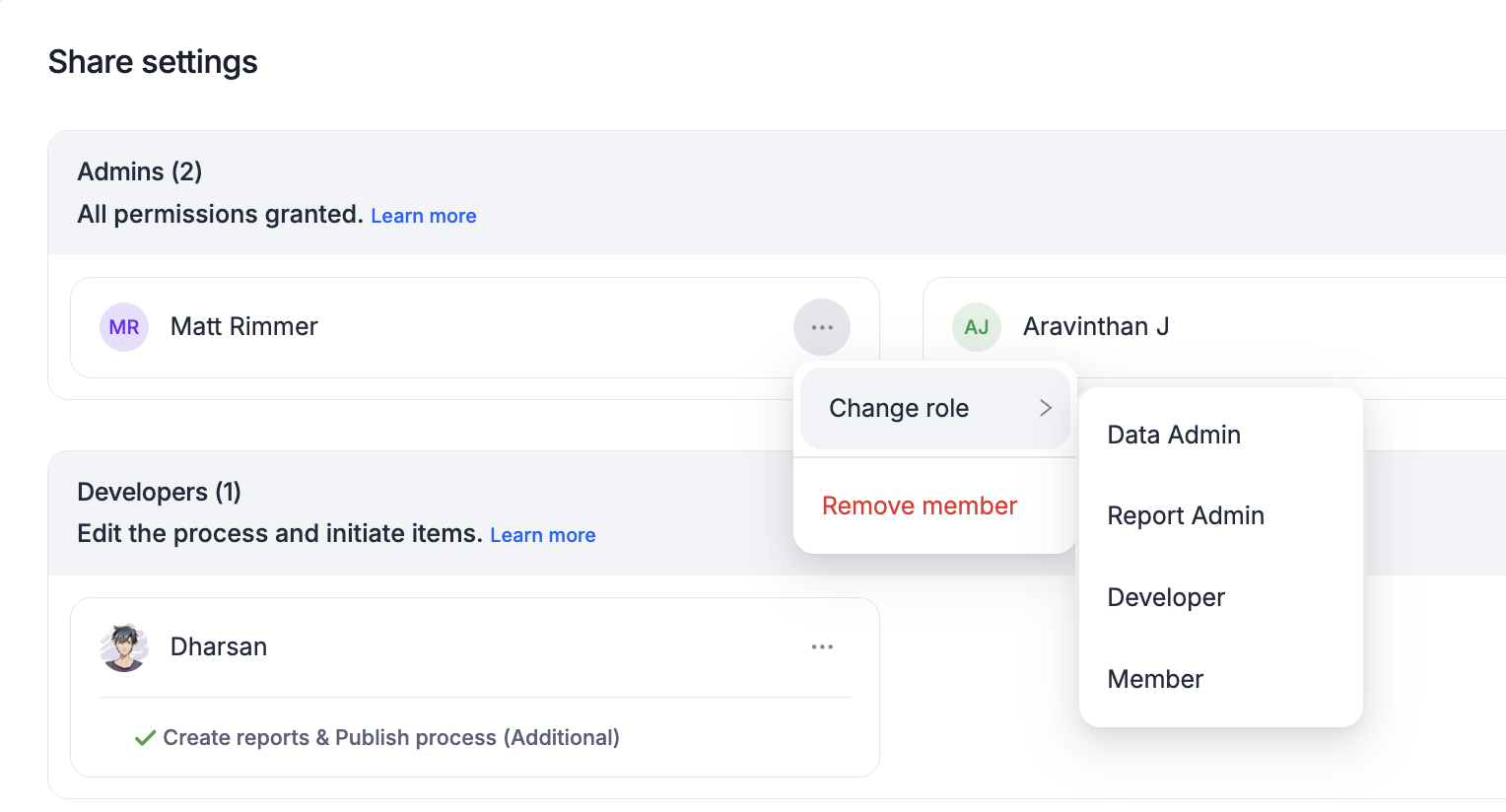 - Add Process Admins, Process Developers, Data Admins, Report Admins, and Members anytime in the due course of the process.