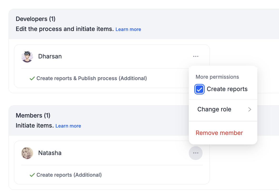 Before removing a member from a process, you must be aware that the member will continue to have access to the reports they had created and accessed in the past after they are removed. However, you can choose to revoke their access to their reports and then remove them as necessary.