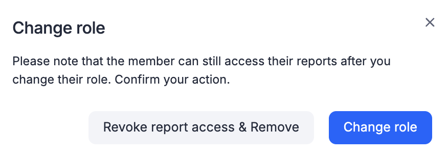 - Click Change role to modify the member's role and retain their report access as is or click Revoke report access & Change to restrict them from accessing their old reports after they move to the new role.