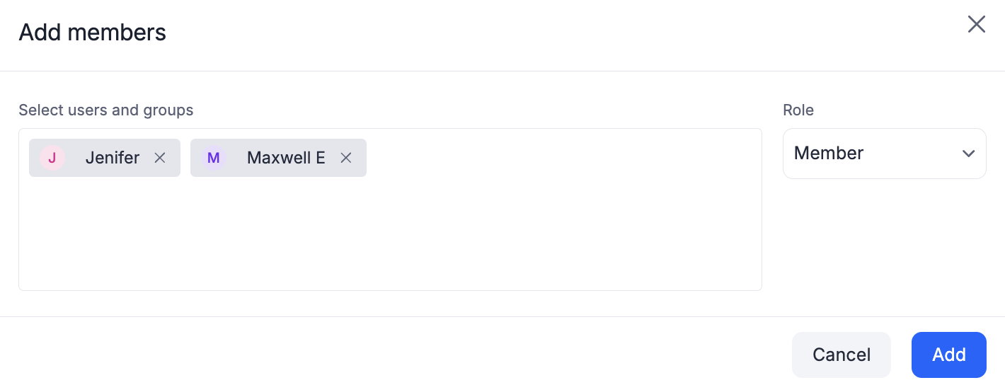 - Select a relevant role from the Role dropdown after adding the users. If you are not sure about which role to choose, learn about the different roles and permissions that Kissflow Workflow offers.