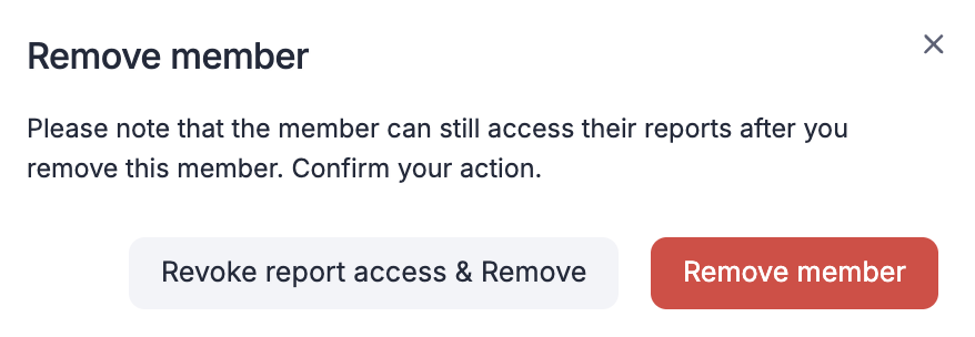 - Click Remove member to remove the member and retain their report access, or click Revoke report access & Remove to restrict them from accessing their old reports after they exit the process.