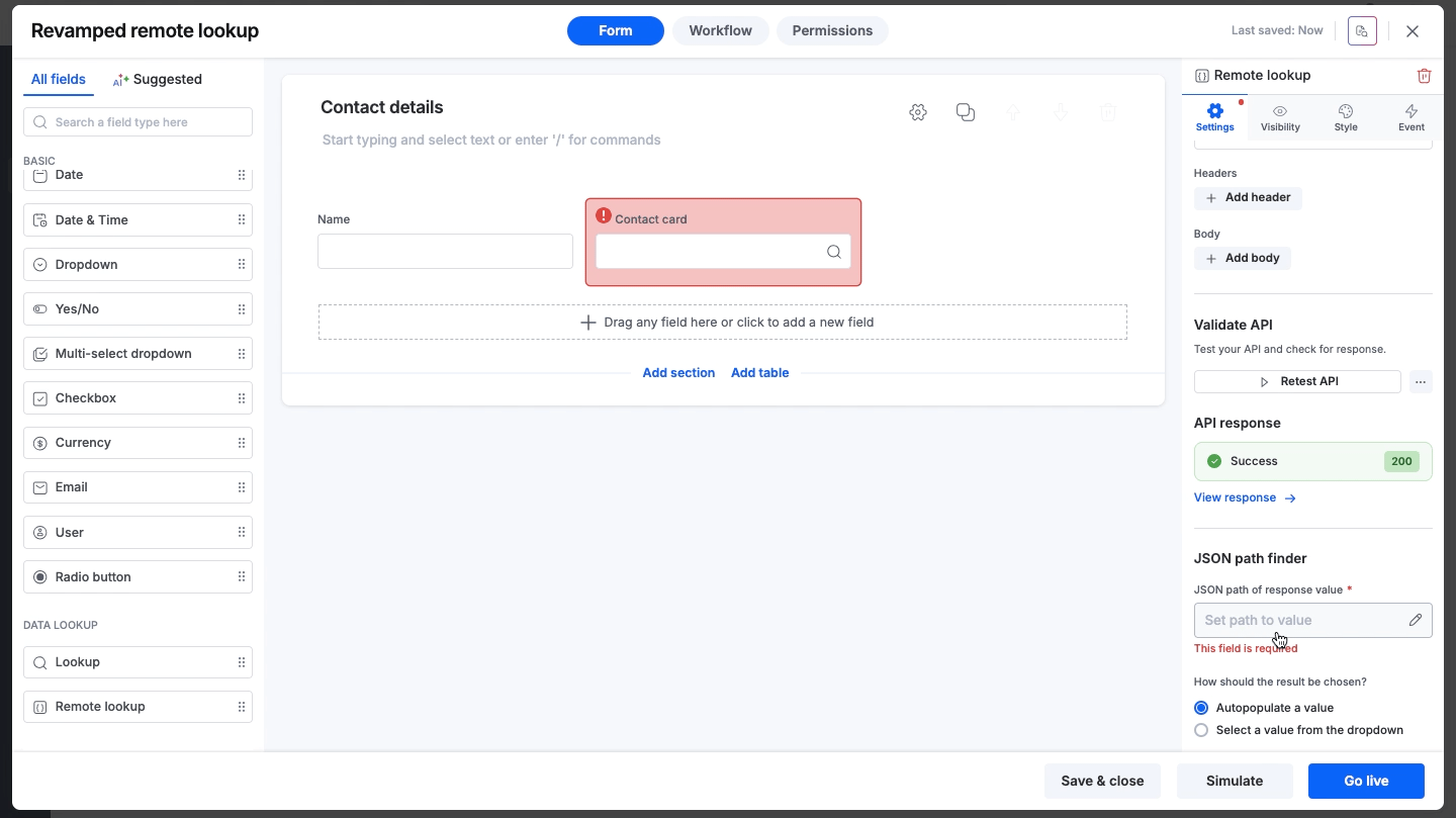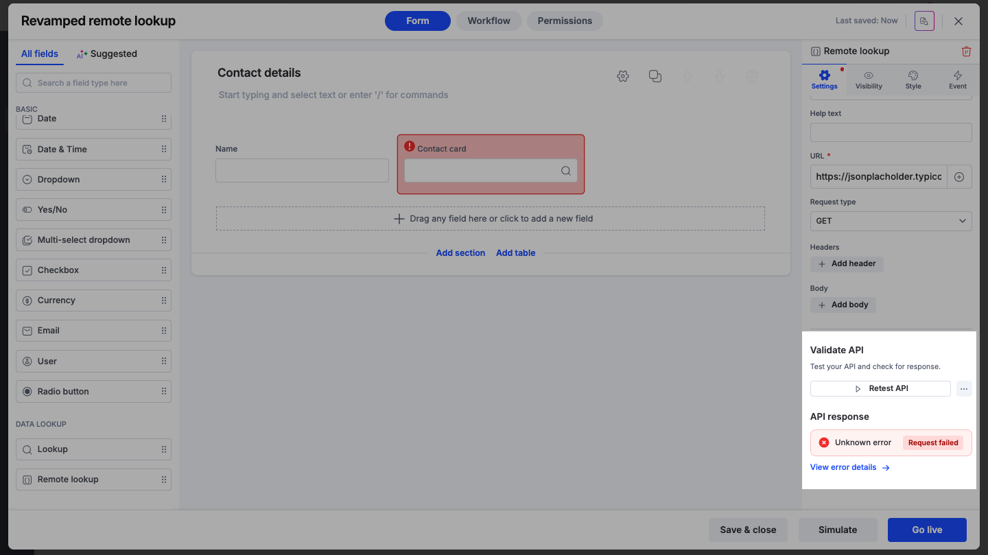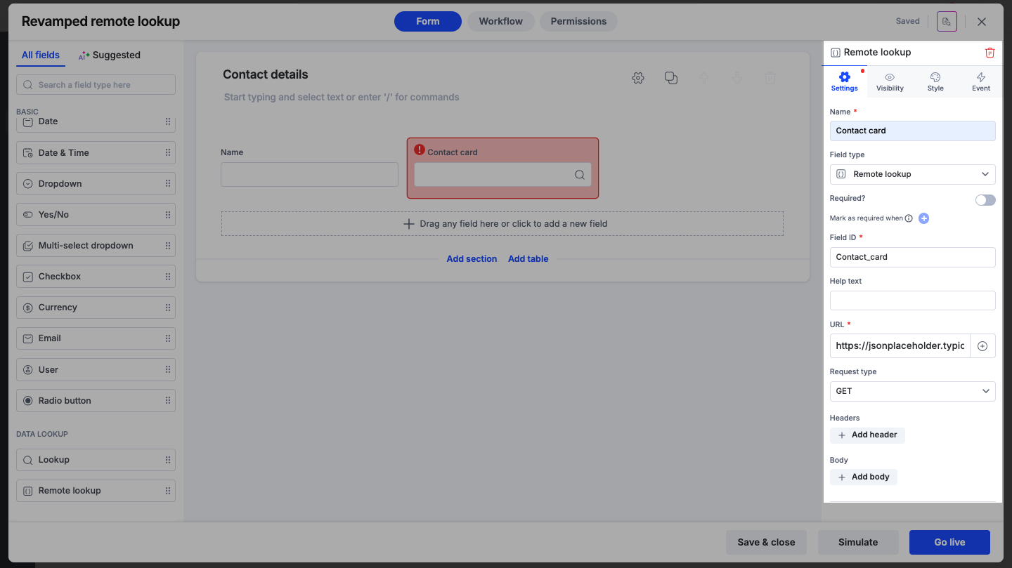 The Remote lookup field allows you to fetch data from external systems and display it within your form. By configuring URLs, request types, and headers, you can create fields that interact with third-party APIs to retrieve real-time data.