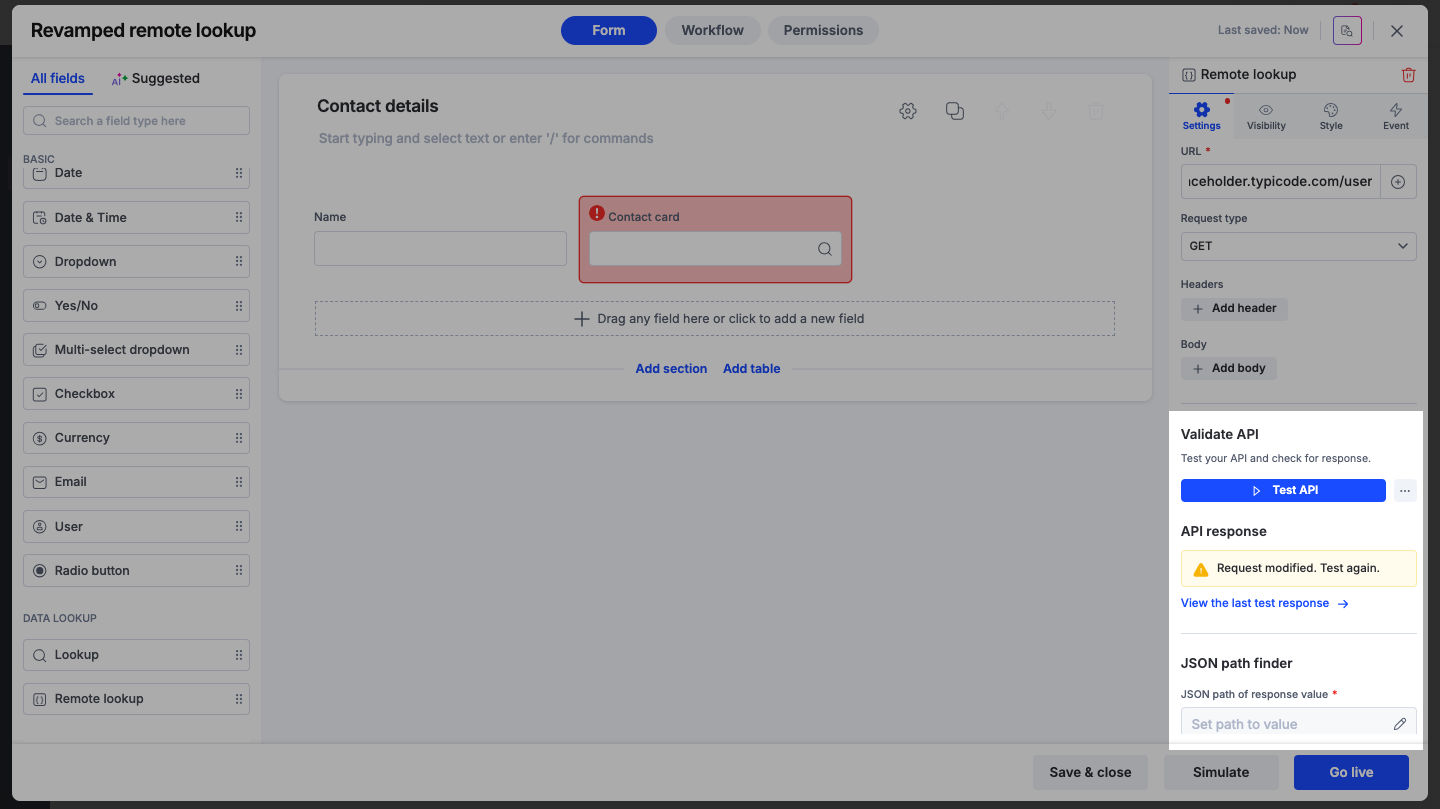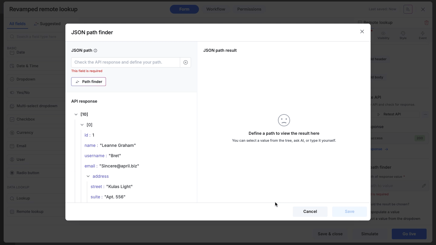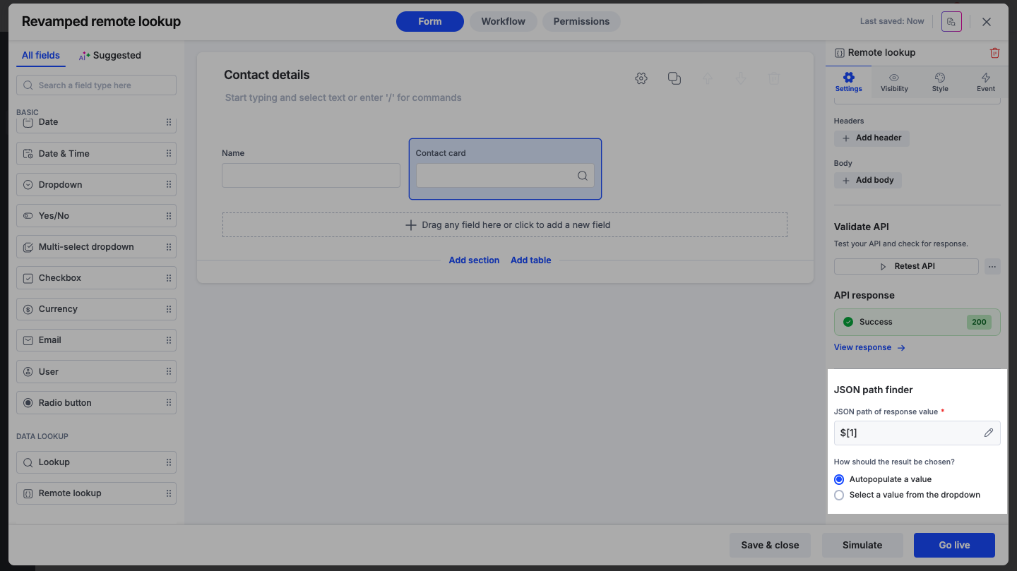 The Remote lookup field allows you to fetch data from external systems and display it within your form. By configuring URLs, request types, and headers, you can create fields that interact with third-party APIs to retrieve real-time data.