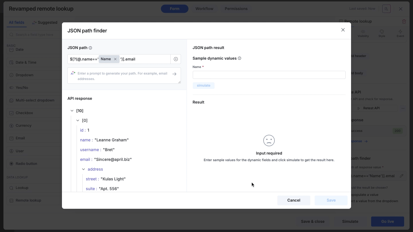 Simply type a natural language prompt into the search bar (for example, Give me city names or Get user emails). The system will interpret your request and automatically generate the correct JSON path (For example, $[*].address.city) for you.