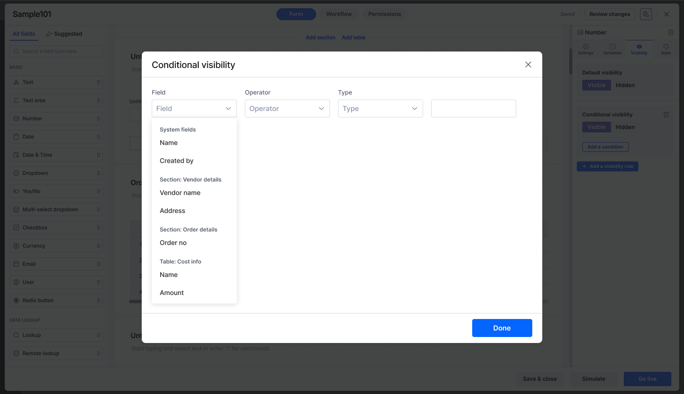 Until now, table logic has been isolated. Referencing parent fields (that is, fields in your form's sections) in table fields’ conditions, such as visibility and validation rules, requires workarounds. For example, to show specific columns (like From city) based on a parent field selection (like Travel), you have to create redundant helper columns inside the table to bridge the data. This often resulted in cluttered UIs.