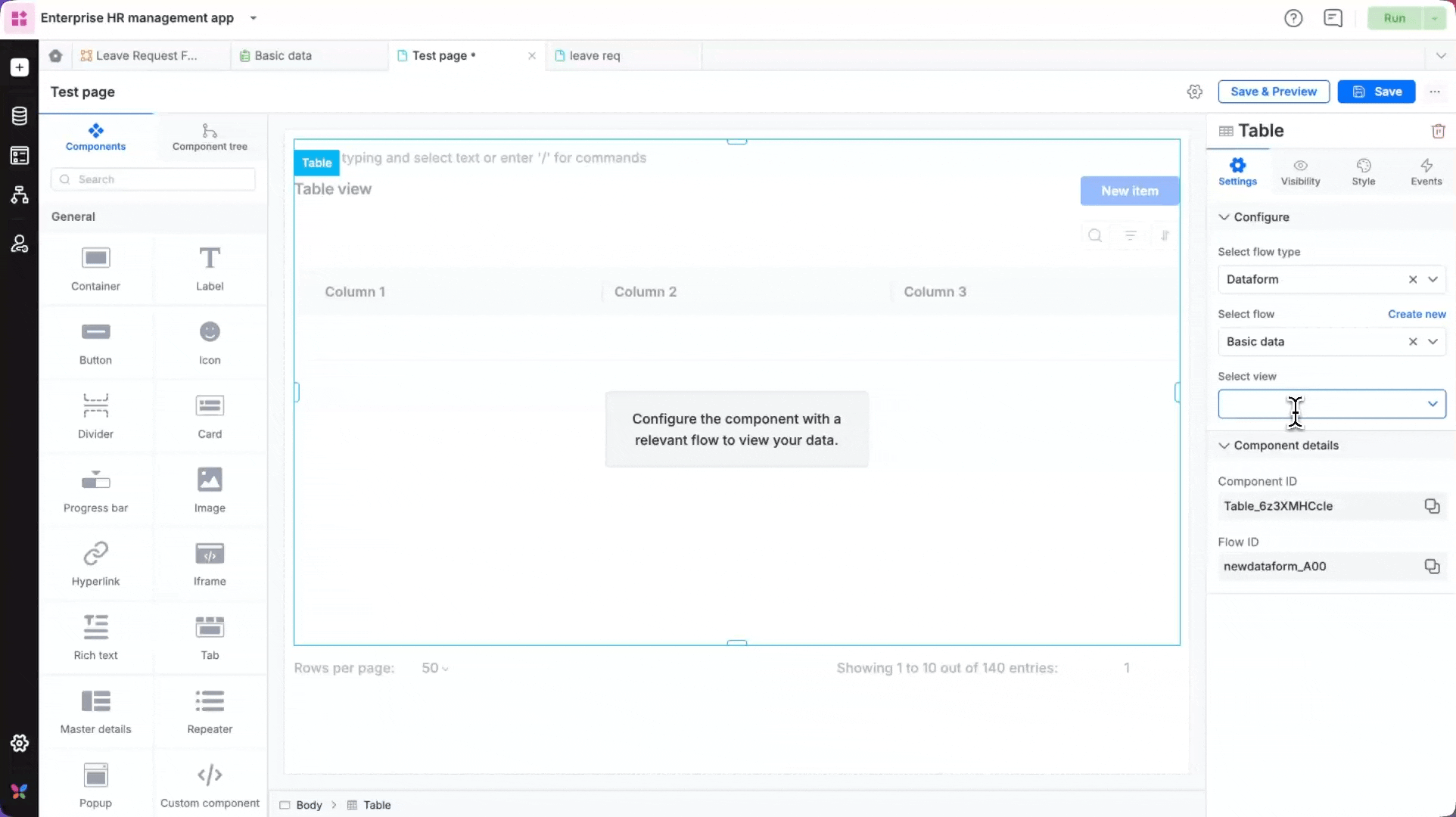 - Next, access Pages and create a page. Drag and drop the Form component under Views. In the right side panel, Select Dataform as flow type, your dataform name as the flow, and All items under Select view