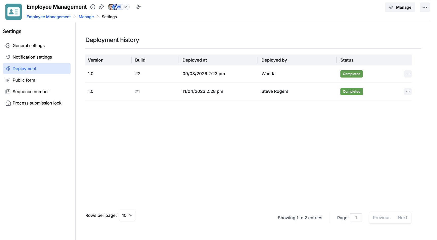 Administrators can also manage Process submission lock from outside the app builder, at Manage > Settings > Process submission lock. This provides a faster way to lock or unlock a process without requiring a new deployment.