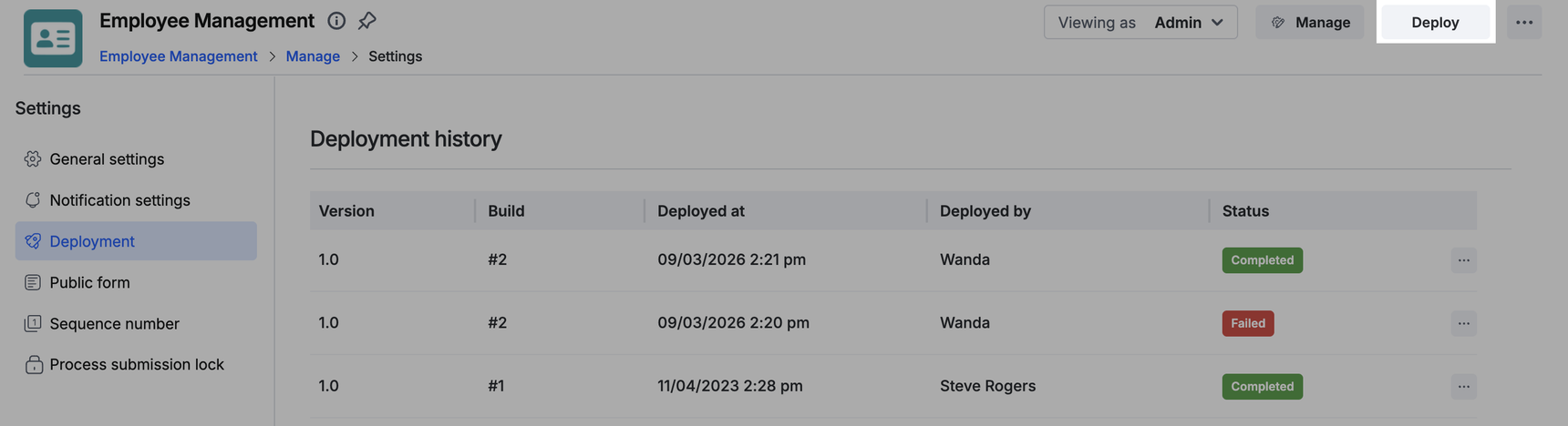 If you are an app admin in the development environment, you will have the permission to deploy apps to production after developing it. To move an app to the target environment, simply click Deploy.