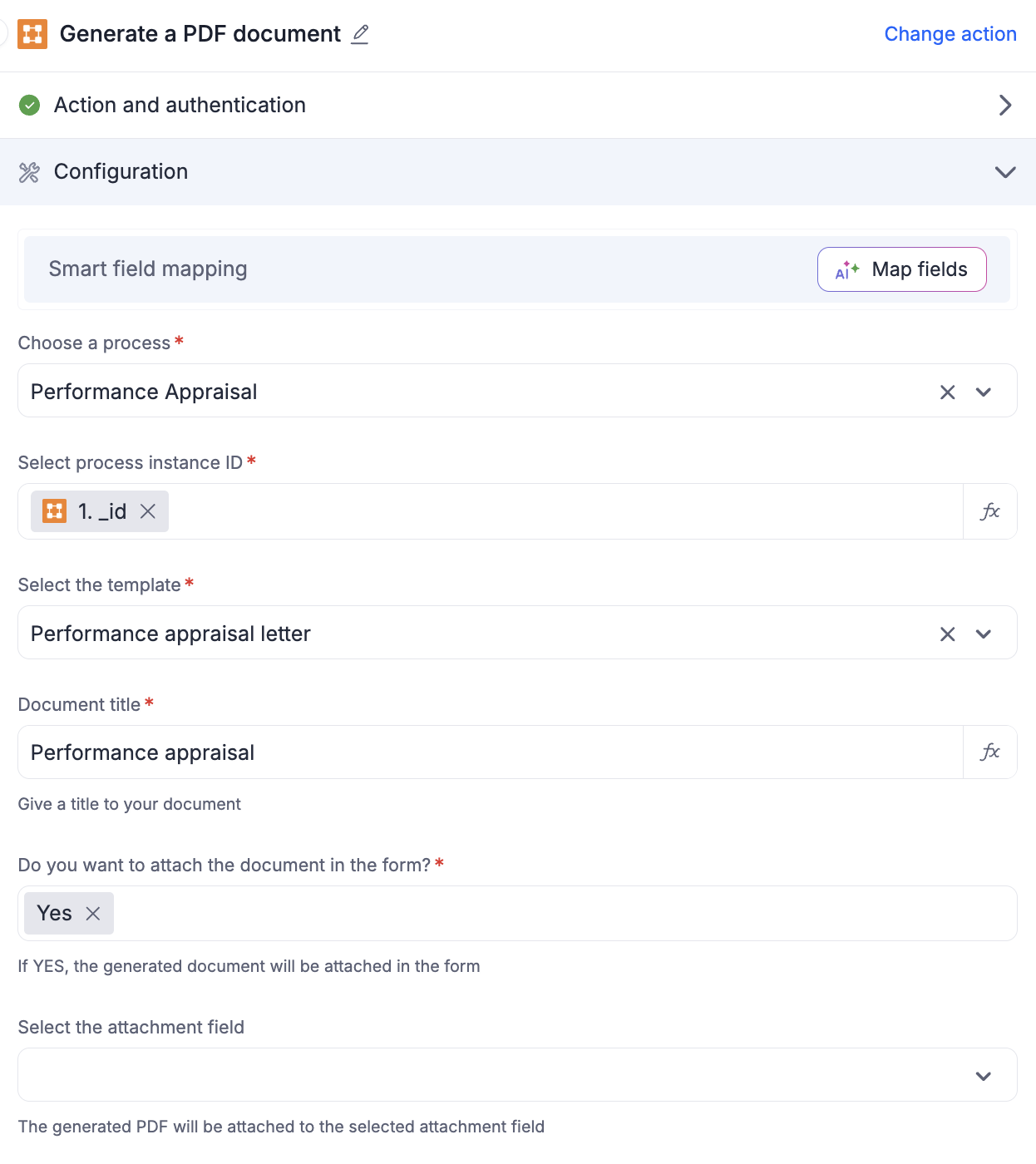 - Enter the title of the document and choose whether the document must be shared as an attachment in the process form. If yes, select the specific attachment field to which the generated PDF must be attached.
