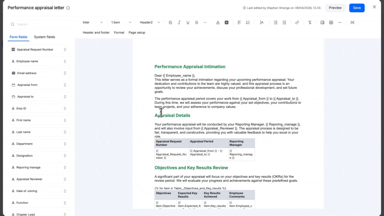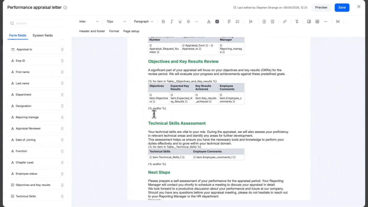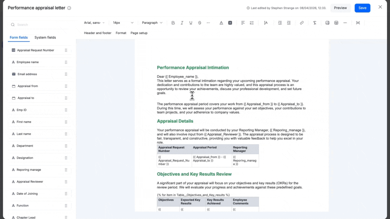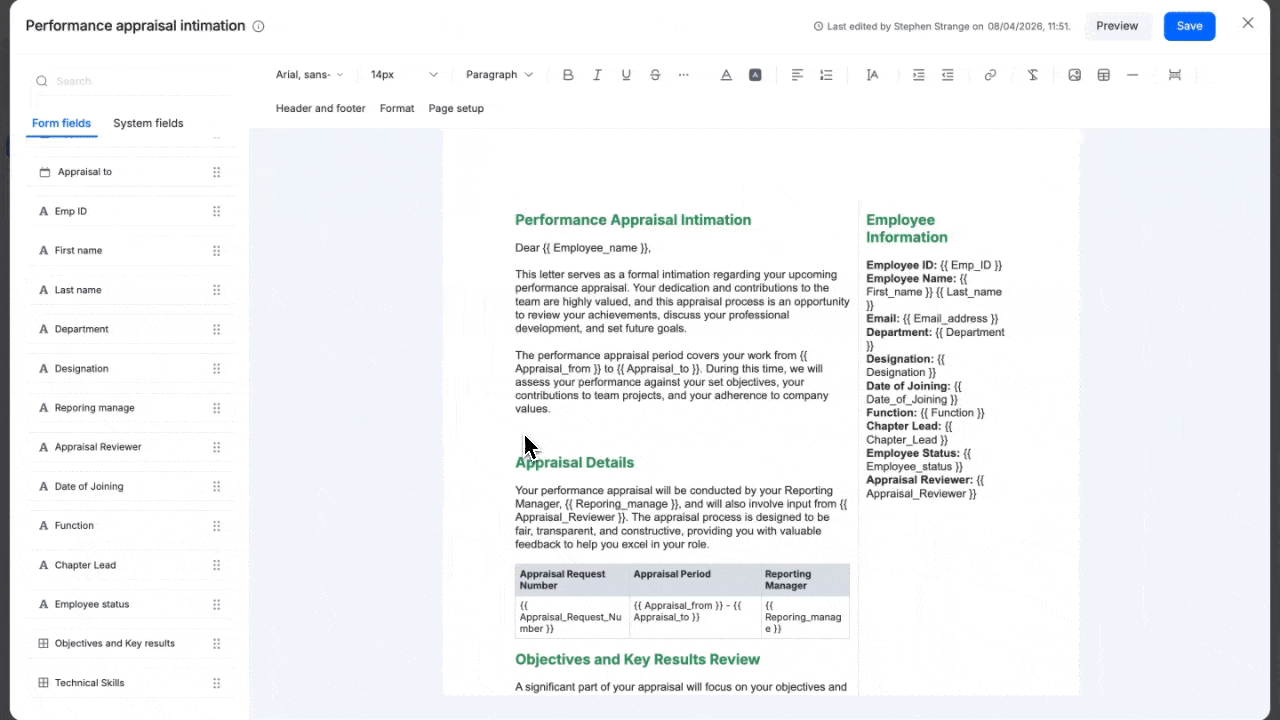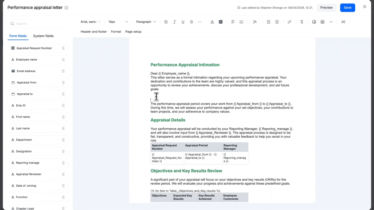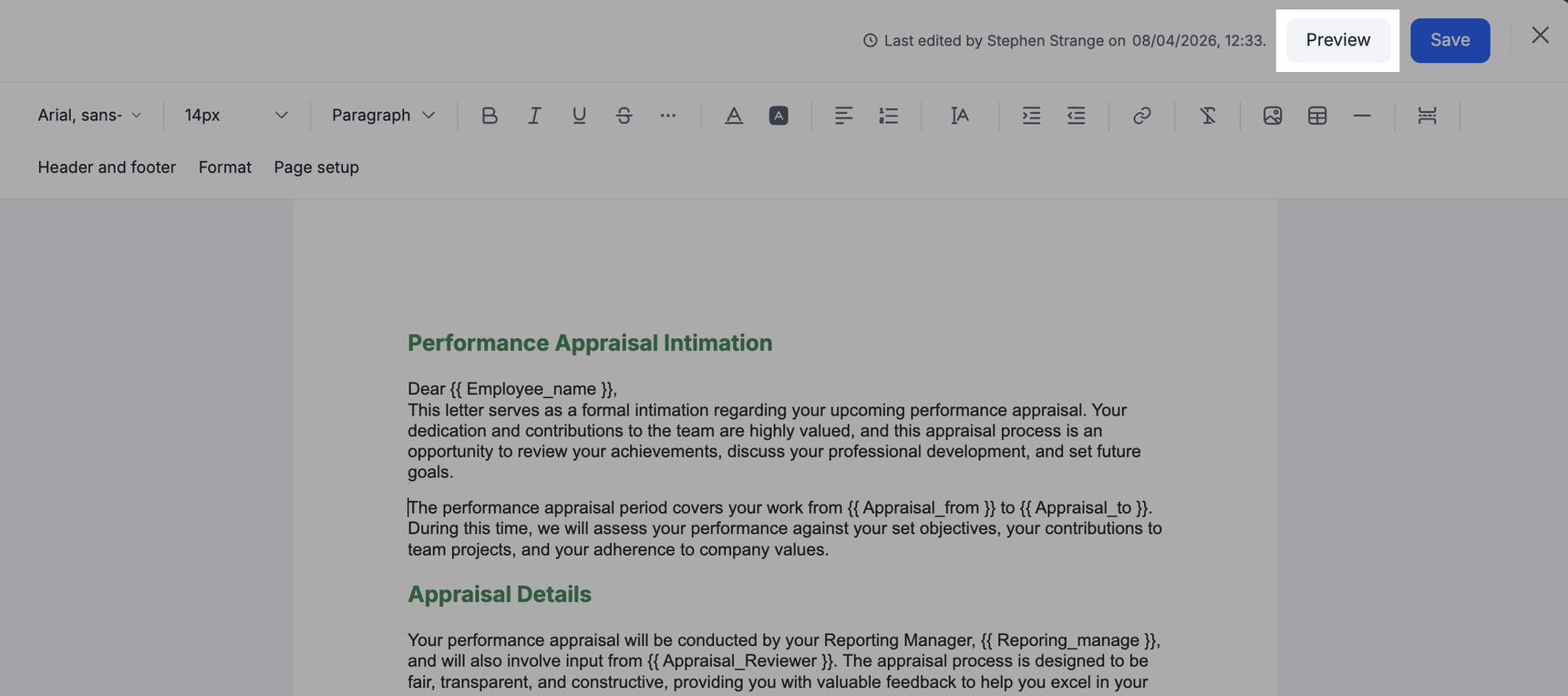 - Once you've added the necessary content, you can preview the document template by Saving it and clicking the Preview button.