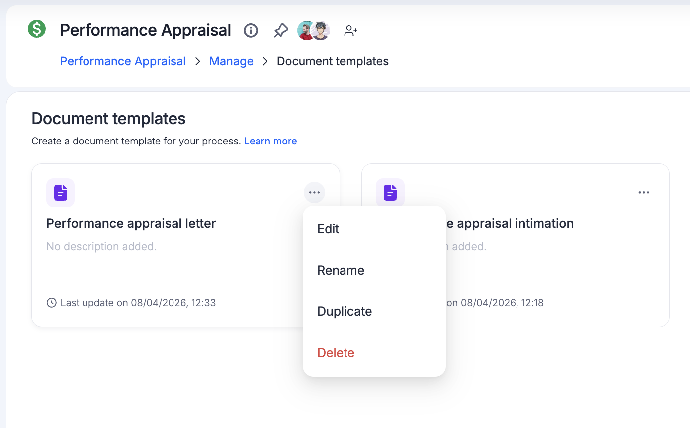 Use Kissflow AI to help you craft your document template instantly. Navigate to the process for which you would like to create a document template. Click Manage > Document templates > Create template > Generate using AI.