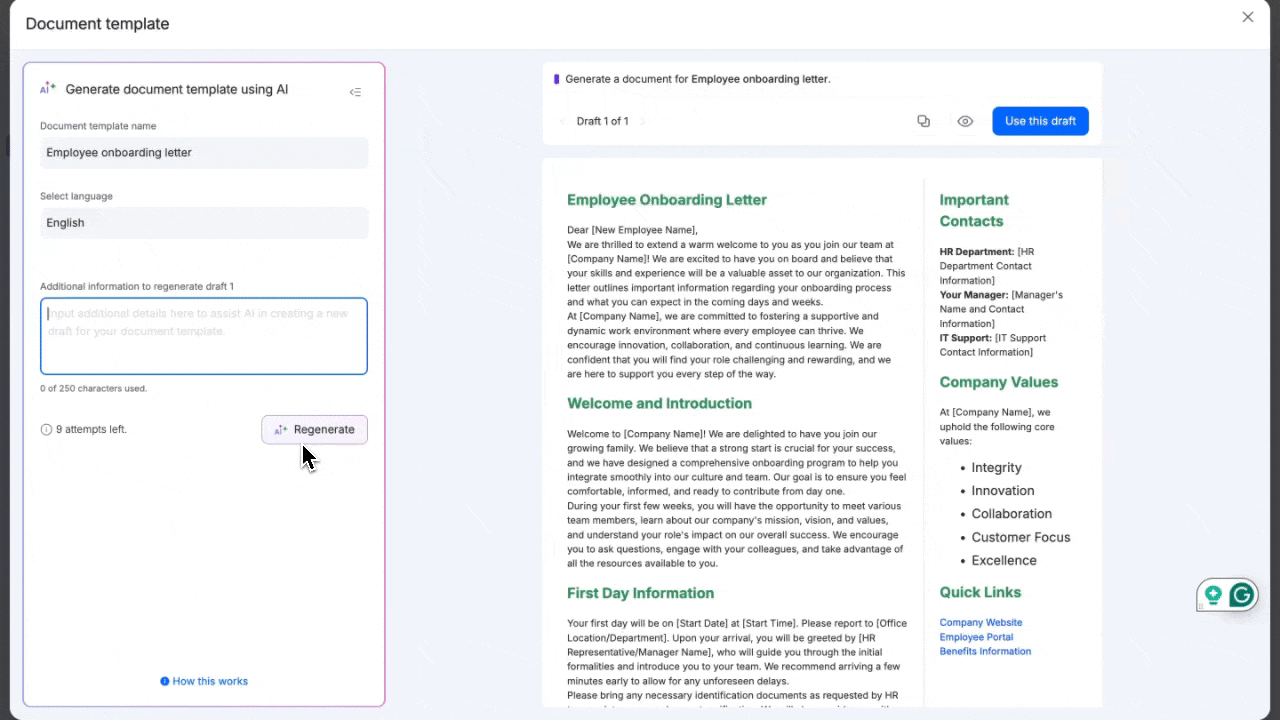 Enter the document template name, for example, Employee Offer Letter or Purchase Order, select a language for the template, and click Generate to create the first draft called Draft 1.