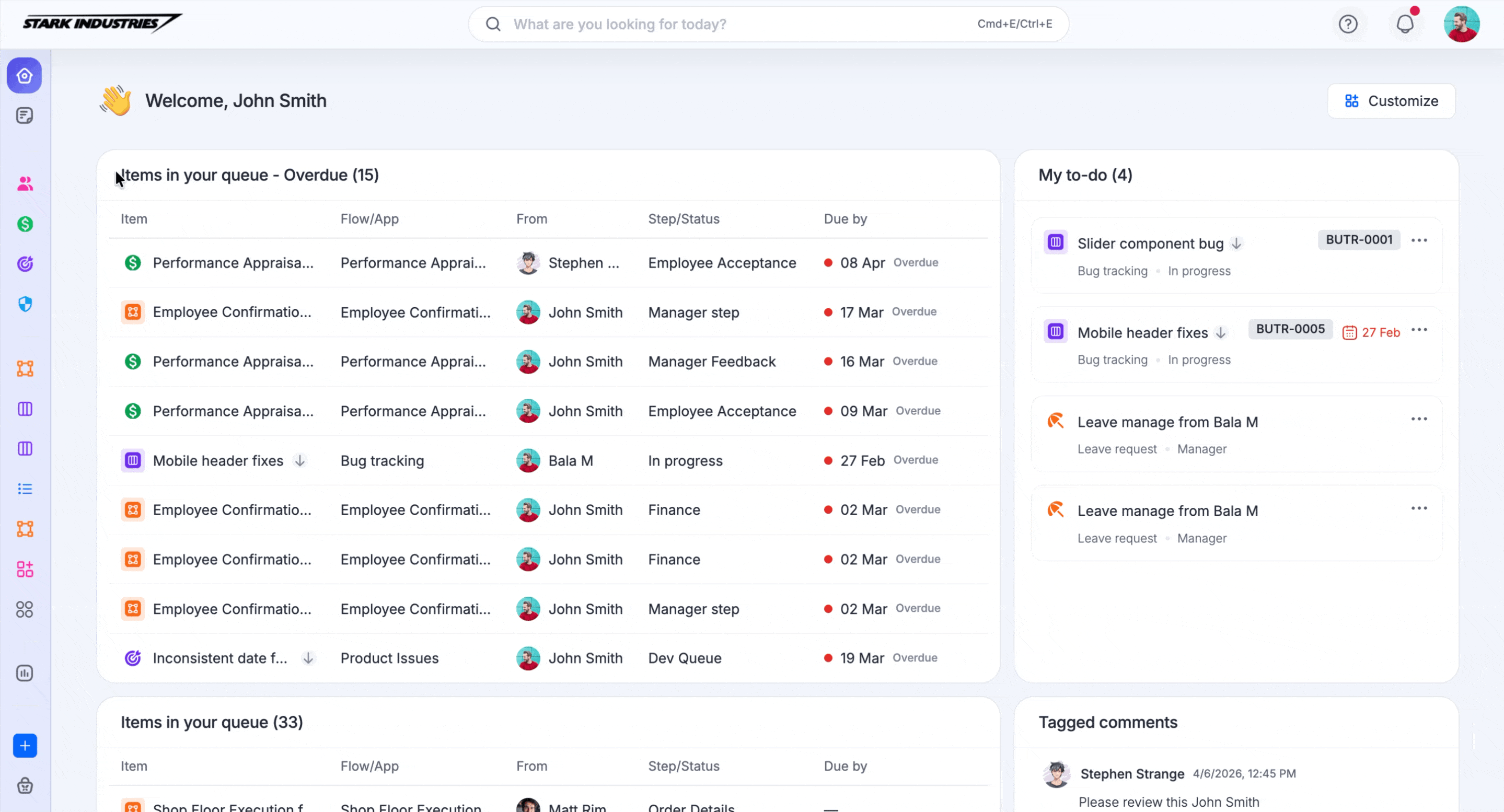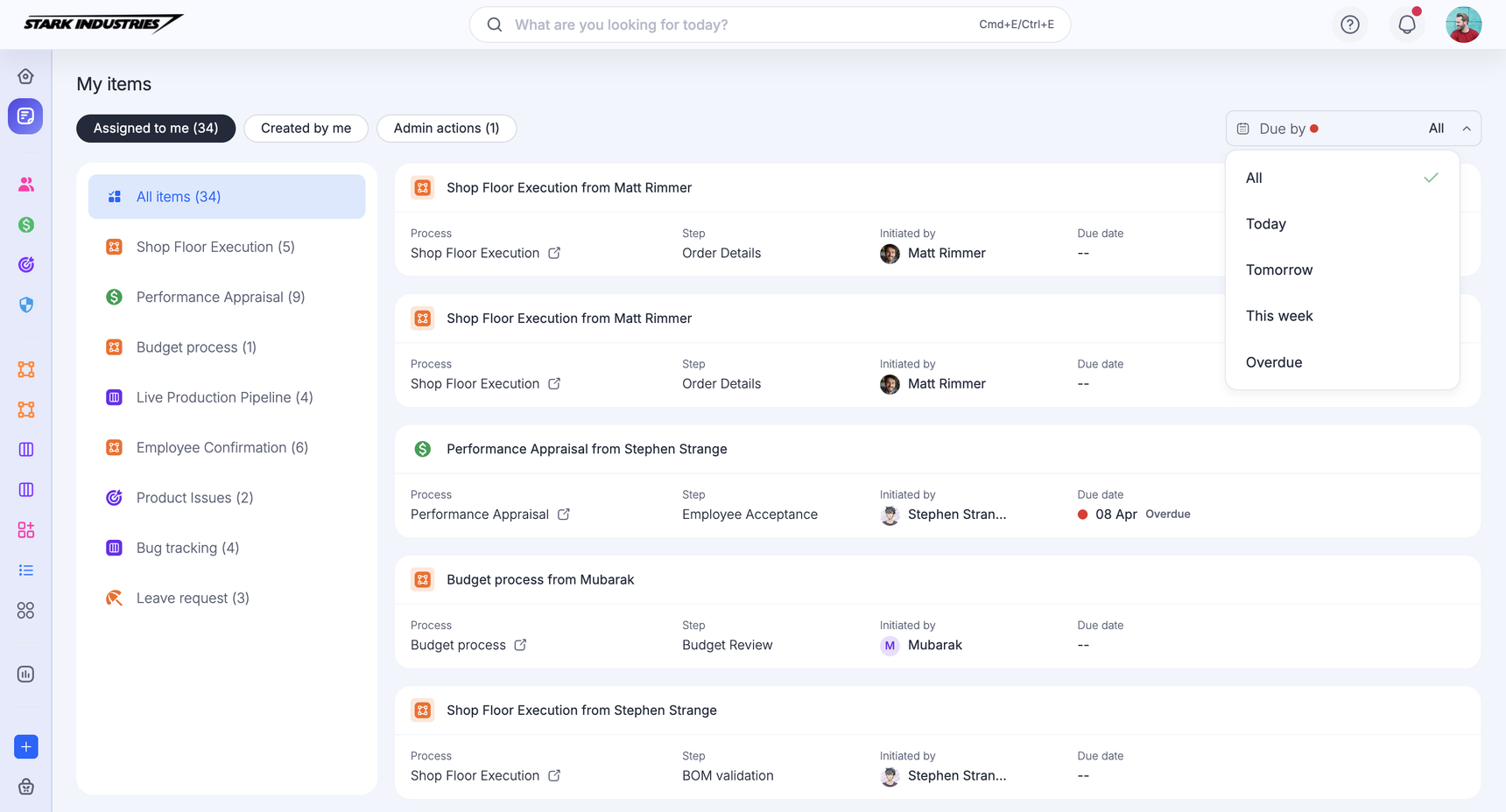You can find items assigned to you from multiple processes, boards, and apps using the navigation panel on this page. Items are sorted and listed based on how recently they were assigned to you. The most recently assigned items appear at the top. Click any item to open the associated process or board form. After making any changes, you can close the item to return to the Assigned to me page. You can also dive into specific items by applying filters based on the due date.