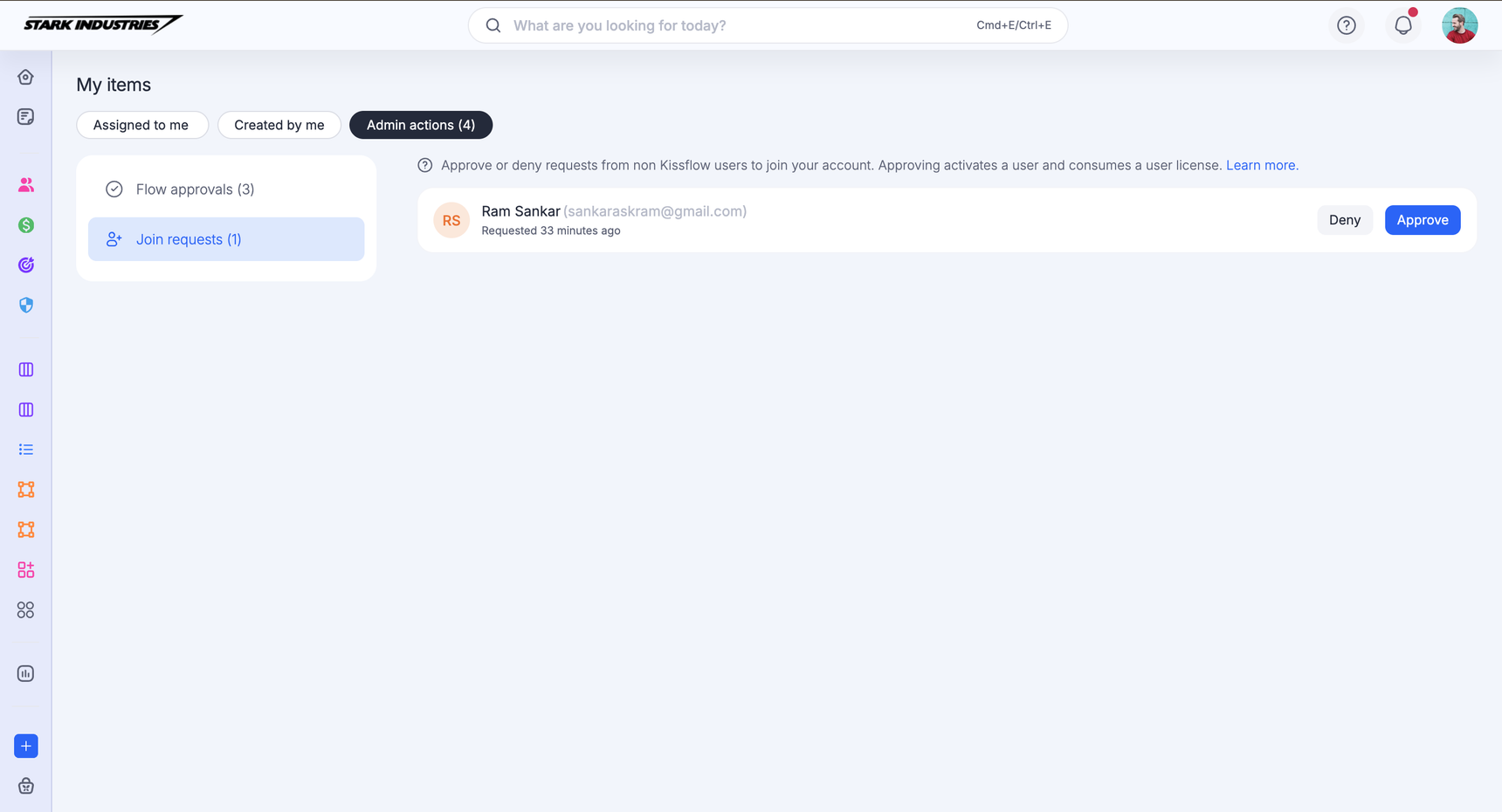 If you allow new signups under sign up preferences, users outside your Kissflow account can request to join your account using the unique join URL link. Once a new join request is received, Account Admins will be able to view this under Global My items > Admin actions > Join requests. You can either approve or deny these join requests from here. If the Account Admin approves an external user's join request, the user is added to and is made active in the Kissflow account. If no user licenses are available in your account, an error will be thrown when you try to activate that user, and they will still remain in a requested state.