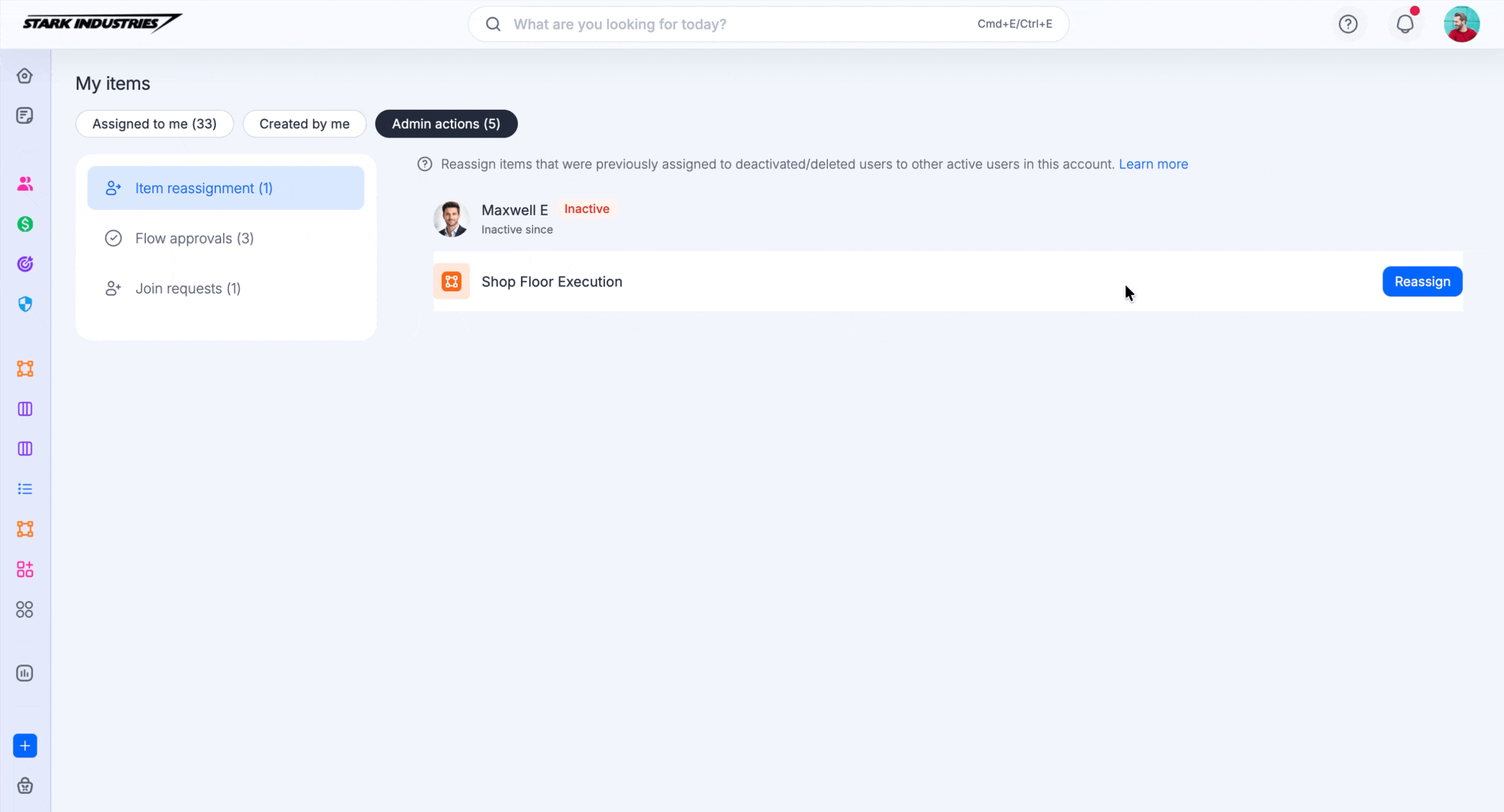 Items that were previously assigned to deactivated or deleted users usually remain incomplete, with no one to act on them. These items are listed under the Item reassignment tab. Account Admins or Flow admins can reassign these pending items to active users in the account to complete them. The Flow Admin can assign individual items to specific users one at a time. The items belonging to the user that were recently deactivated or deleted are ranked first.