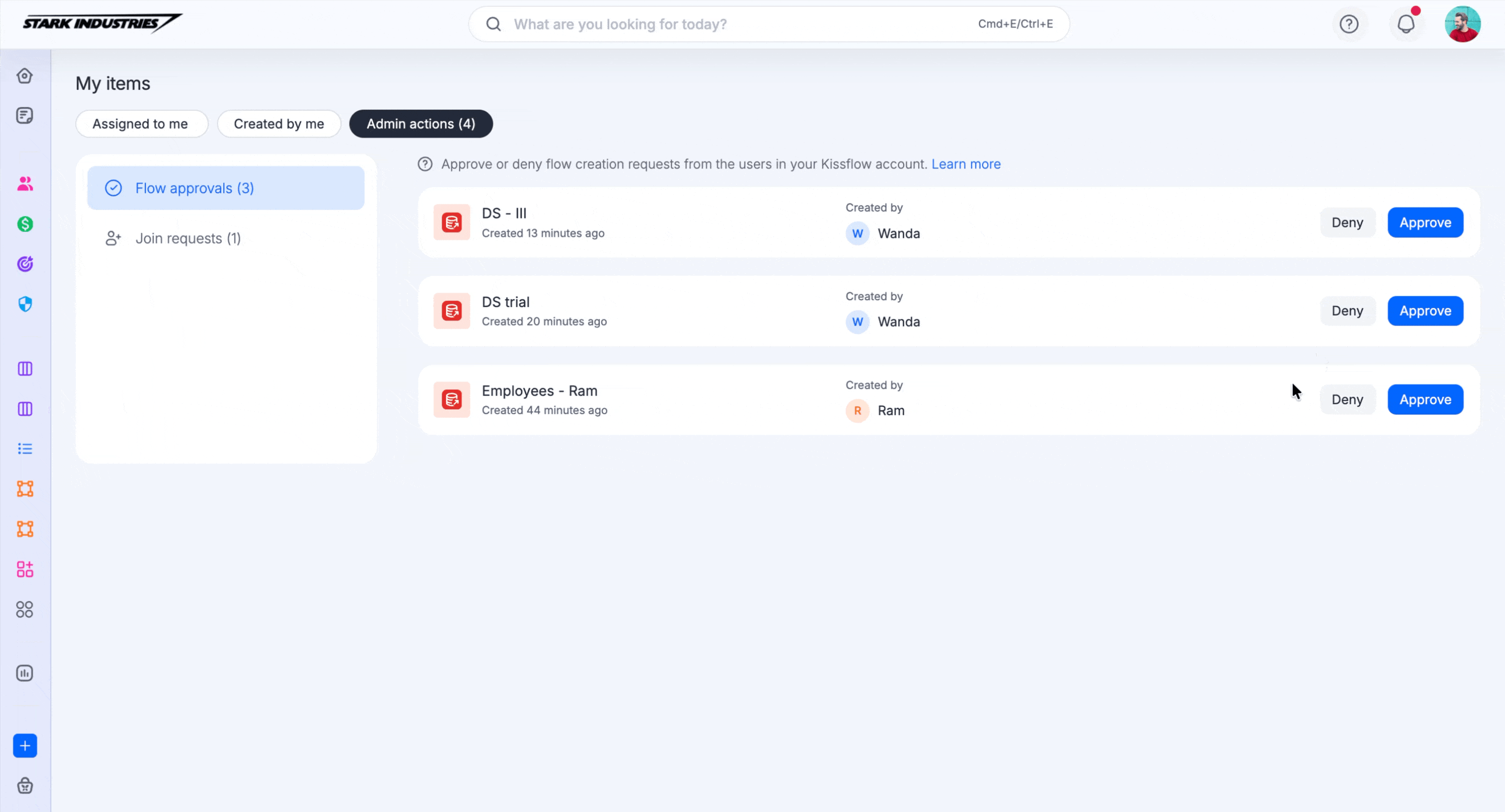 All users in Kissflow can create processes, boards, and datasets by default. However, if you’ve selected Anyone after the approval of as your approval criterion under Flow settings, you’ll need to specify flow approvers. When new flow requests show up in your account, they’re listed here for all the specified Flow admins. Approvers can either Approve or Deny flow creation requests.