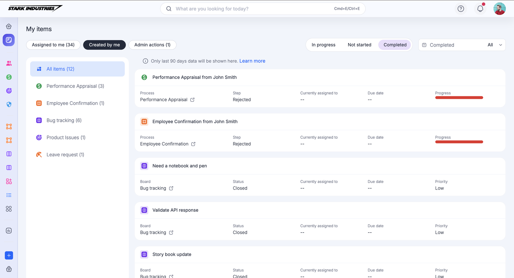 Completed - Items created by you in the Completed, Withdrawn, and Rejected statuses across processes, as well as all items in the Done and Closed statuses across different boards, will be listed here for the last 90 days.