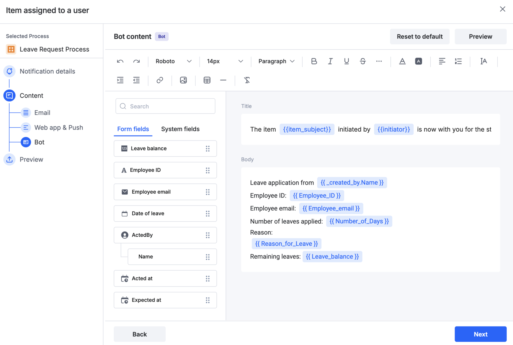 Currently, notification customization in Kissflow is available for channels like Email, Web app, and Push, where you can include relevant field data from the item to provide context.