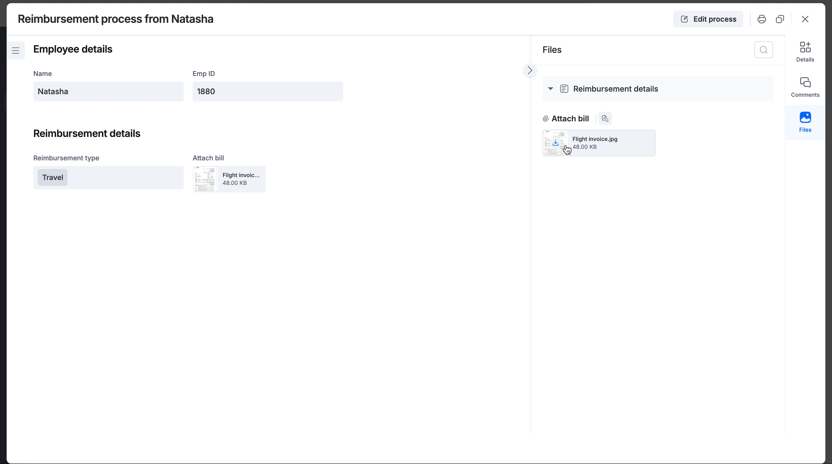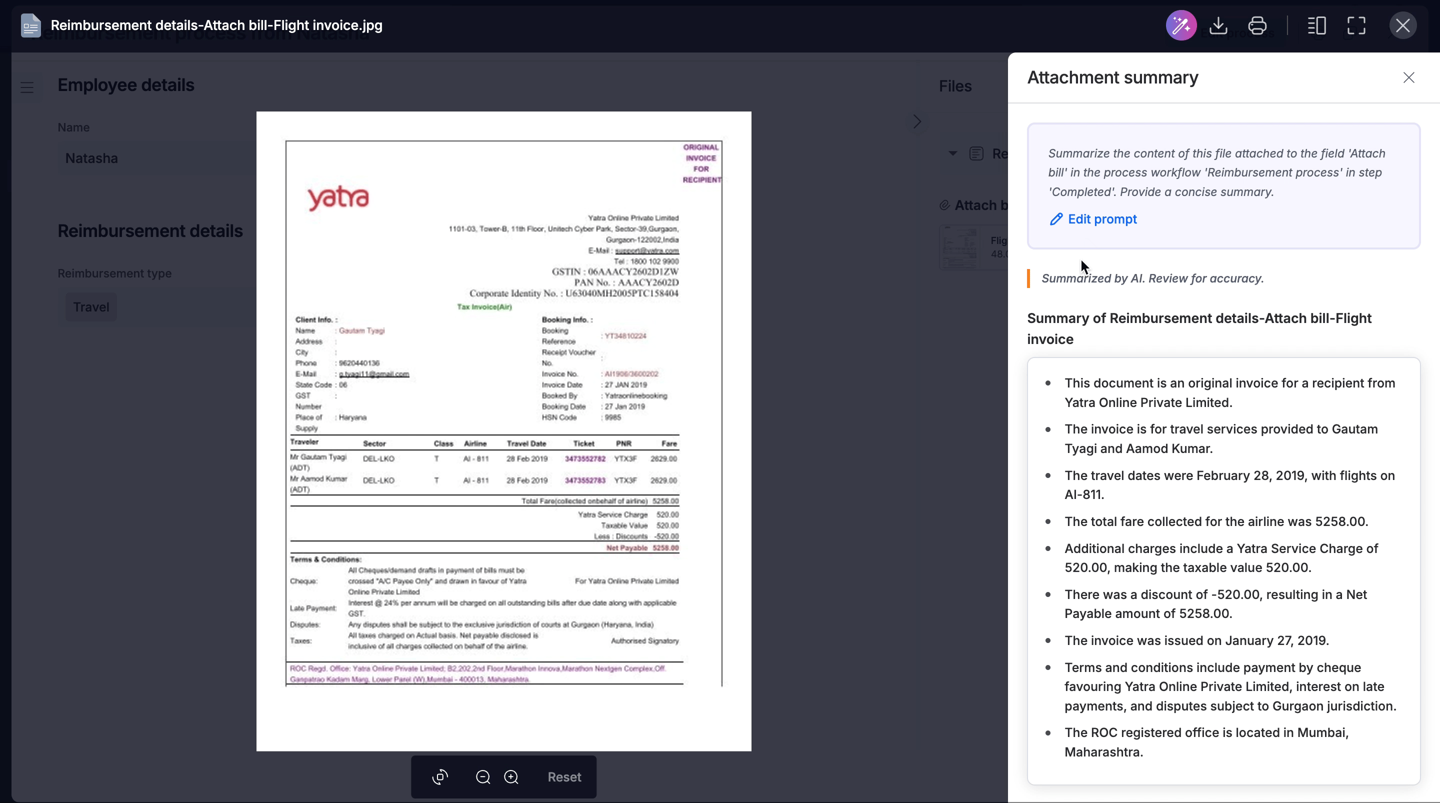 The smart attachment field enables users to automatically fill empty form fields using an attached document. This AI-powered feature does intelligent document processing (IDP), by extracting data from the uploaded document and mapping it to respective fields in the form.