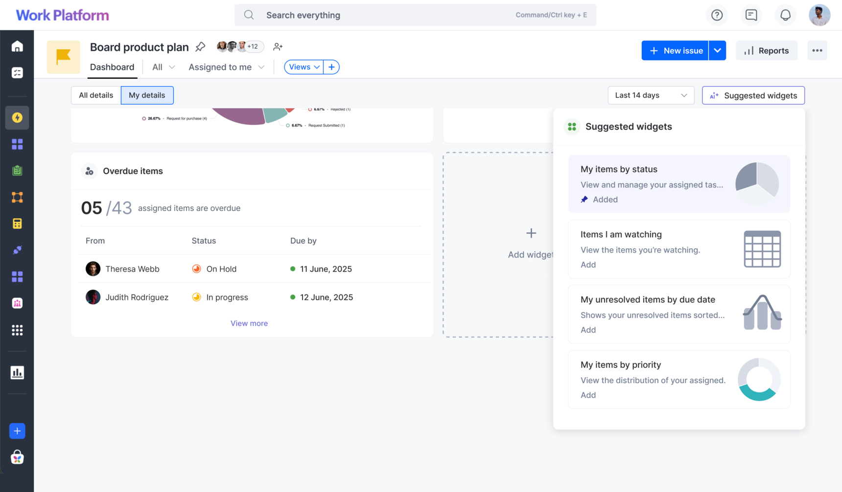 In addition to the default widgets above, you can add AI-suggested widgets tailored to your tasks and priorities — helping you see what’s most relevant to your work.