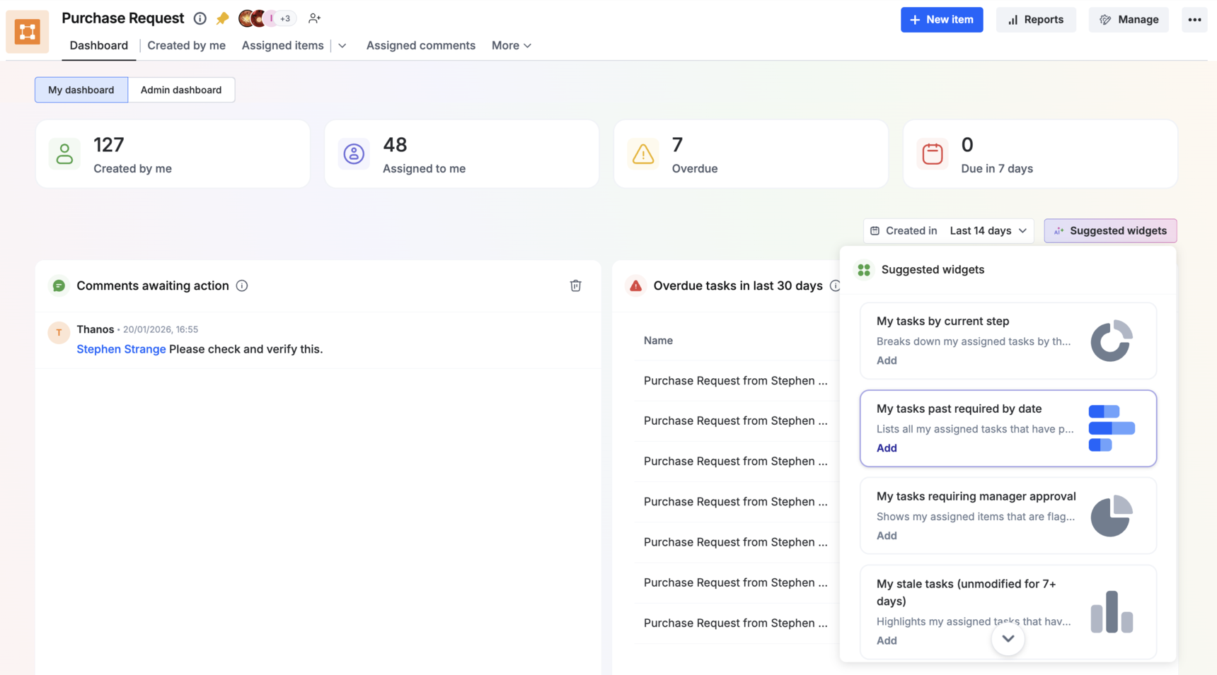 In addition to the default widgets above, AI will suggest additional widgets tailored to your tasks and priorities, helping you see what’s most relevant to your work.